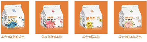 羊大师产品有鲜羊奶、草莓羊奶、红枣枸杞羊奶,麦香羊奶、酸羊奶,益生菌羊奶、蓝莓羊奶。