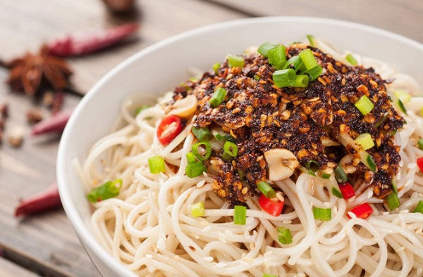 所谓小面,就是素面,没有任何浇头,碱水面快速在沸水里翻滚几下,丢下几根时令蔬菜,然后挑进拌好秘制调料的海碗中搅拌,趁热,呼噜呼噜吸下去。无论如何,那一碗油红菜绿的小面啊,是重庆人的情节。板凳面庄庄的面,不可不尝。
